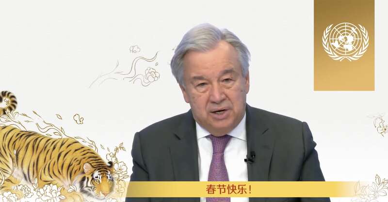 “春节快乐!”联合国秘书长古特雷斯在视频致辞中,首先用中文向全世界华人致以最美好的祝福。古特雷斯说:“老虎象征着力量强大、生气勃勃、勇气十足、坚韧不拔、果敢无畏,这些都是我们今天面对前所未有之挑战时需要的品质。”古特雷斯感谢中国和中国人民对多边主义和联合国的投入与支持。他表示,各国人民必须携手鼎力实现恢复,建设更美好的未来。