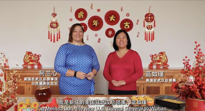 美国驻上海总领事何乐进、驻广州总领事耿欣和新任驻武汉总领事蓝如瑾,也相继发布虎年春节祝福的视频。美国驻华大使馆特别介绍说,农历新年就要到了,这将是美国驻武汉总领事蓝如瑾在武汉的第一个春节,她和同事柯兰心、郦杰人一起做了一桌美国南方新年的传统家常菜,庆祝佳节。与中国家庭一样,这里的新年菜肴都包含着美国南方人对家人、朋友的美好祝福。